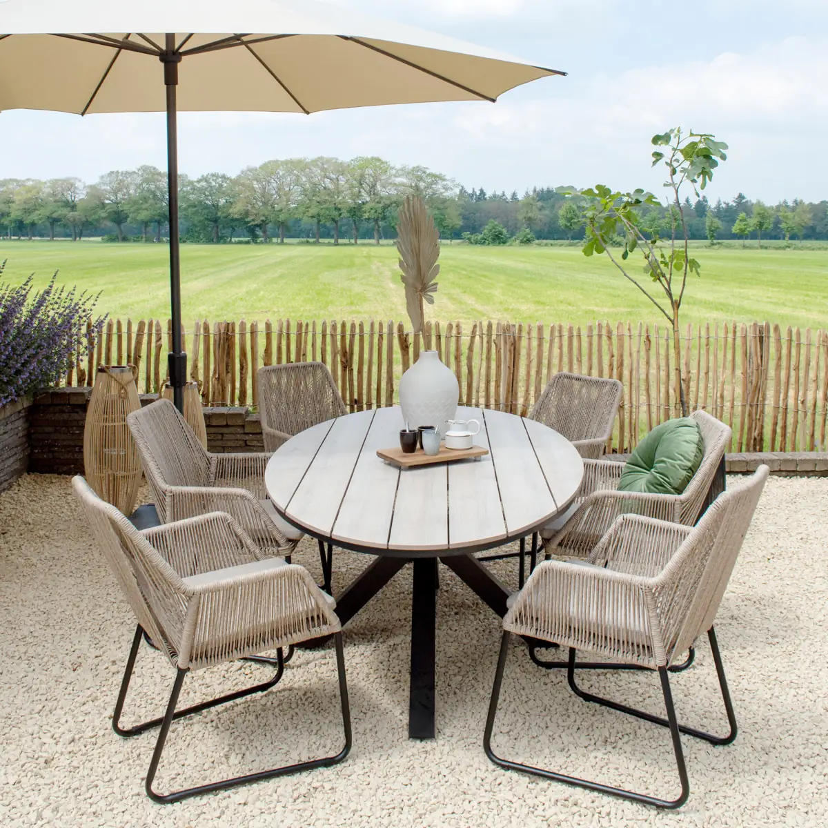 Aan de Cyprus ovale tuintafel wordt buiten eten een echte belevenis.De tafel valt direct op door zijn elegante, ovale vorm, die niet alleen prachtig oogt, maar ook praktisch is. De afgeronde hoeken zorgen ervoor dat iedereen gezellig rondom kan zitten, zonder strakke lijnen of hoeken die het samenzijn belemmeren. Het tafelblad is gemaakt van hoogwaardig polywood, een onderhoudsvrij materiaal dat bekendstaat om zijn natuurlijke uitstraling en duurzaamheid. Het materiaal is UV-bestendig en eenvoudig schoon te houden, wat betekent dat je jarenlang plezier zult hebben van deze tafel. Het zwart gepoedercoate aluminium X-poot onderstel geeft de tafel een stoere en moderne look, terwijl het tegelijkertijd zorgt voor stabiliteit en stevigheid. Dit tijdloze design past perfect bij diverse tuinstijlen, van modern tot landelijk.
