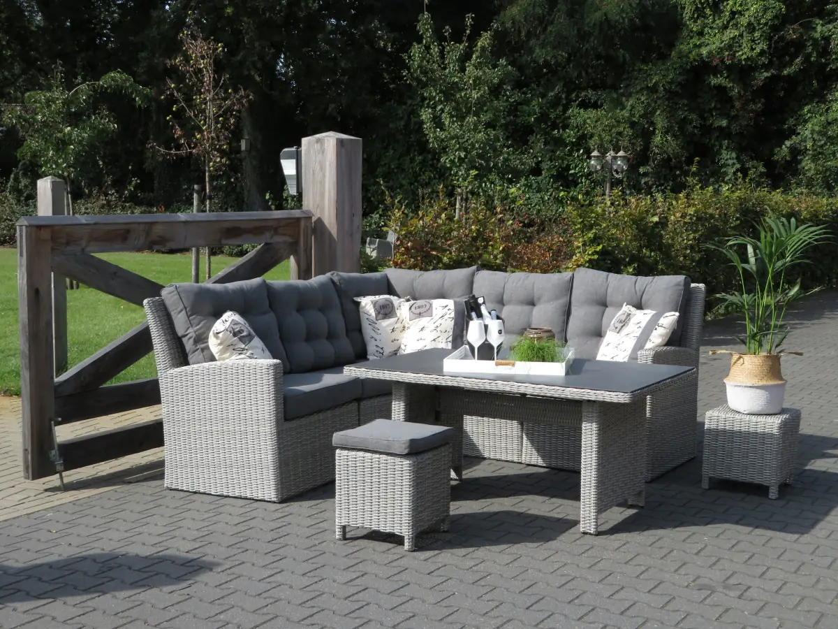 | Eigenschappen | Roestvrij aluminium frame, Landelijke uitstraling, Compact, Waterafstotende kussens, Halfrond wicker |