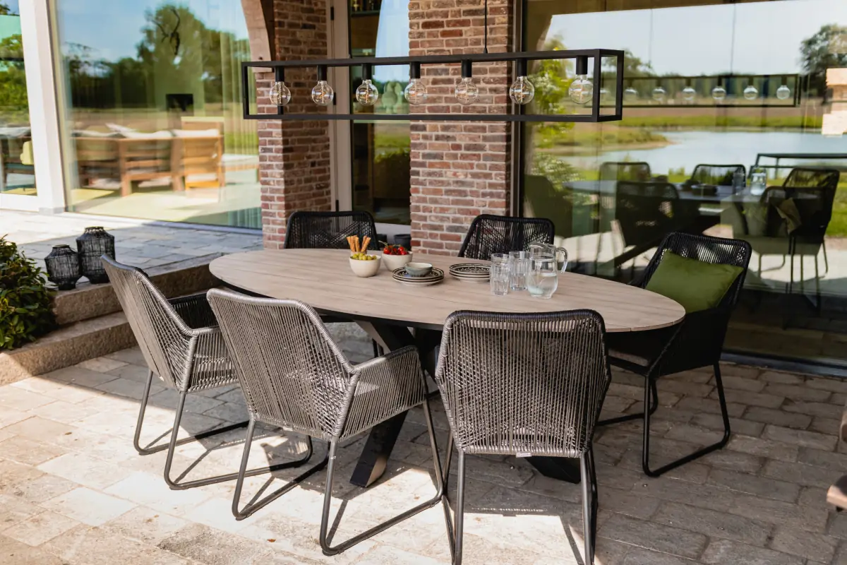 Een ovale tuintafel straalt ruimte en gezelligheid uit, aan een ovale tafel kan iedereen goed met elkaar praten en zit je niet te ver van elkaar af. Ovale tafels zijn weer helemaal terug van weg geweest! De ovale tuintafel bij deze set heeft een blad gemaakt van polywood met een aluminium kruispoot onderstel. Er kan rustig een glas of voetbal op de het blad vallen. De tafel wordt in delen geleverd en is eenvoudig met enkele schroeven en een duidelijke beschrijving te monteren. Wij adviseren de tuintafel, wanneer deze niet gebruikt wordt, af te dekken of op te bergen om de levensduur van het product te verlengen.