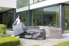 Zorg ervoor dat je alleen het specifieke product bedekt dat je wilt beschermen en laat niet alle accessoires, zoals kussens, nog op de set liggen wanneer je deze langdurig afdekt. Hoewel tuinkussens en andere accessoires gedurende een korte periode onder de hoes kunnen blijven, raden we aan om ze bij langdurige vochtige periodes binnenshuis op te bergen. Dit helpt om deze producten in optimale staat te houden!