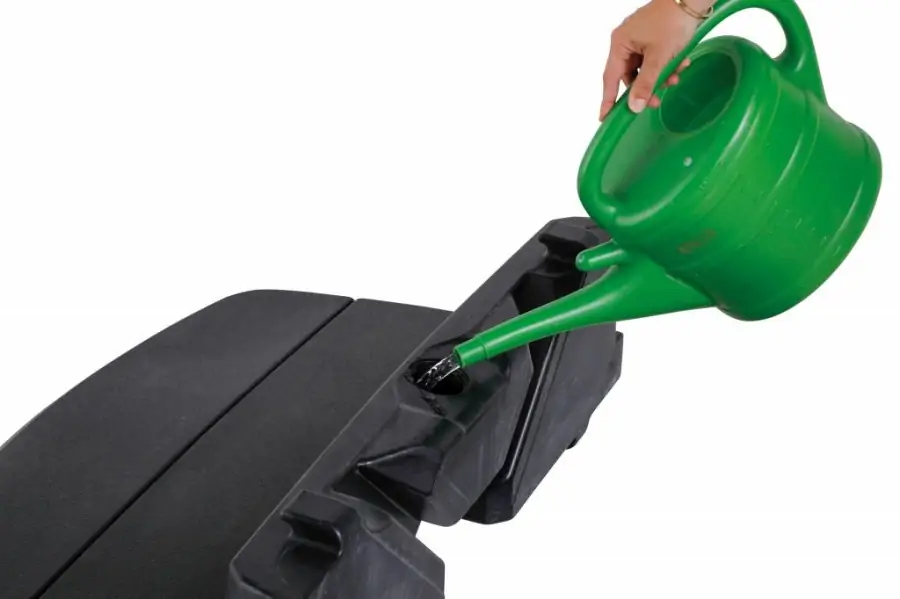 Voor onze zweefparasols hebben wij ook een vulvoet welke gemaakt is van plastic die gevuld moet worden met water of zand omdat plastic van zichzelf licht is qua materiaal en anders de 90kg vereiste norm niet gehaald wordt. Het voordeel is dat wanneer de vul parasolvoet niet gevuld is, hij makkelijk te verplaatsen is. De vulvoet bestaat uit 4 delen die je over de kruisvoet heen schuift. Een andere manier is de kruisvoet vol te leggen met stenen, wat ook erg goed kan. Hiermee heb je samen met de kruisvoet en de stenen de voordeligste optie voor onze zweefparasols.