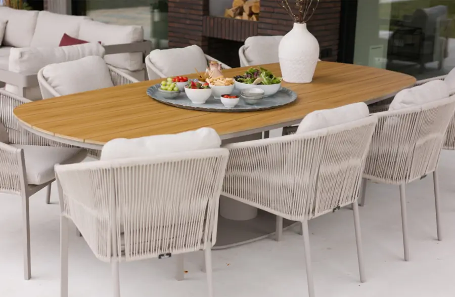 Als je de voordelen van een tuinset voor 8 personen nog niet kende, leggen we ze graag even voor je uit. Onze tuinset voor 8 personen is altijd voorzien van een ruime tafel van 240 cm of groter, zodat je genoeg plek hebt om comfortabel aan te schuiven en gezellig te tafelen. Er is volop ruimte rond de tafel, waardoor je makkelijk met een groter gezelschap kunt samenkomen. Bovendien is er altijd genoeg plek om, indien nodig, extra stoelen aan de kopse kanten van de tafel te plaatsen. Zo blijft je tuinset voor 8 personen altijd ruim en uitnodigend. Al onze tuinsets voor 8 personen bestaan uit een tuintafel en bijpassende stoelen, maar alle onderdelen zijn ook los van elkaar verkrijgbaar, zodat je de set naar wens kunt uitbreiden. We bieden zowel ronde, ovale als rechthoekige sets aan, zodat er altijd een optie is die bij jouw tuin en stijl past.