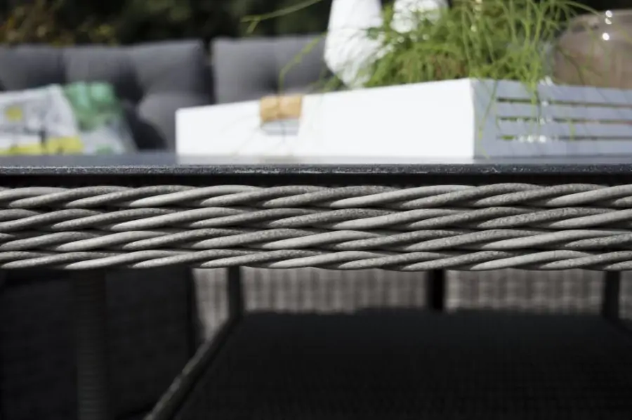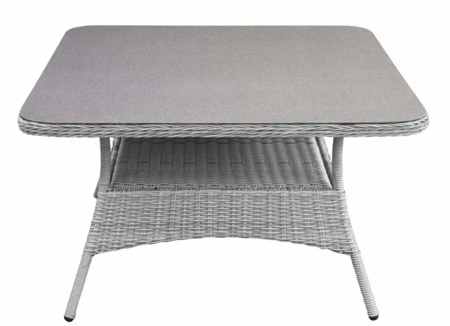 De vierkante tuintafel wicker uit onze collectie is gemaakt van volledig halfrond wicker op een aluminium frame. Deze vierkante tuintafel wicker is voorzien van een keramieken tafelblad. Dit een veiligheids-glasplaat met daarop een laag gemengd steen. Hierdoor krijgt de plaat van de tuintafel een granieten uitstraling. De vierkante wicker tafel is onderdeel van onze Dublin lounge-dining serie en deze kun je eindeloos combineren, zo stel je gemakkelijk je eigen tuinset samen.